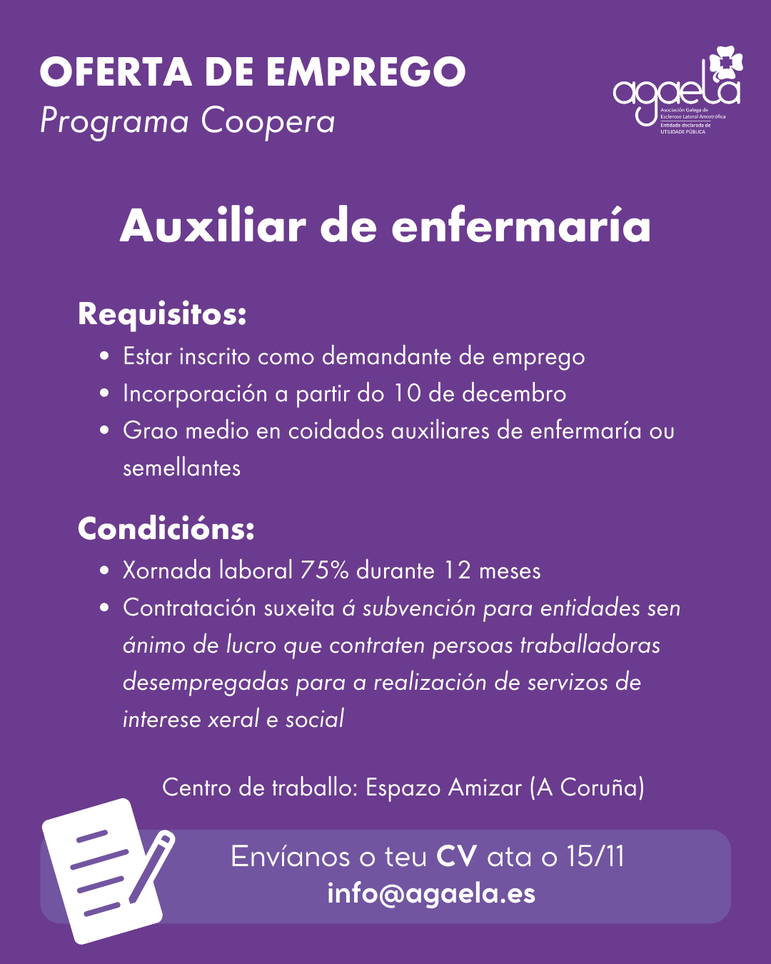 Se cumpres os requisitos envía o teu CV a info@agaela.es ata o 15 de novembro.