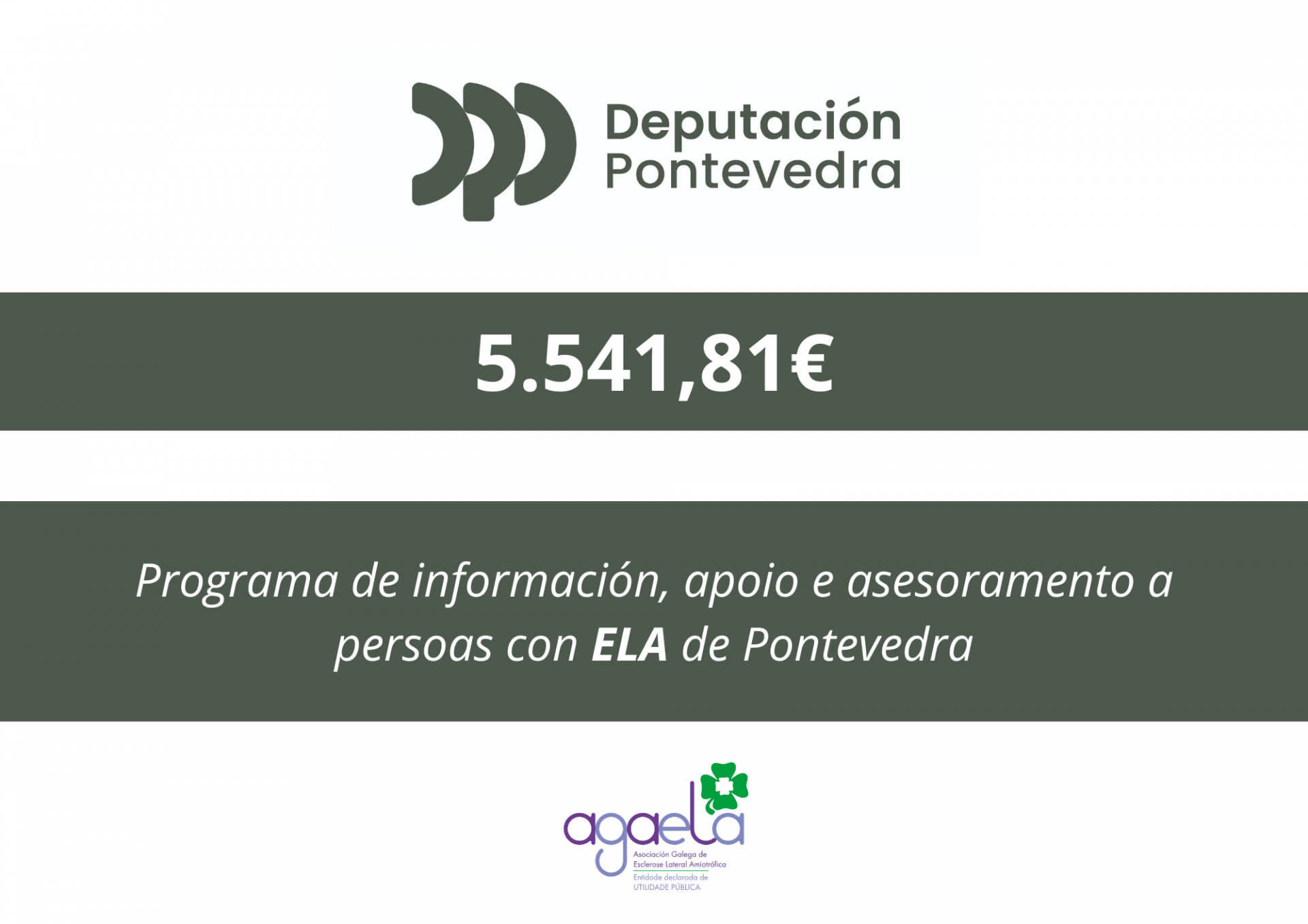 A Xunta de Goberno da Deputación de Pontevedra acordou conceder á Asociación Galega de Esclerose Lateral Amiotrófica (AGAELA) unha subvención por importe de 5.541,81€ para o desenvolvemento do Programa de información, apoio e asesoramento a persoas con ELA, no marco das subvencións dirixidas a entidades sen fins de lucro para actuacións no ámbito social durante o ano 2025.